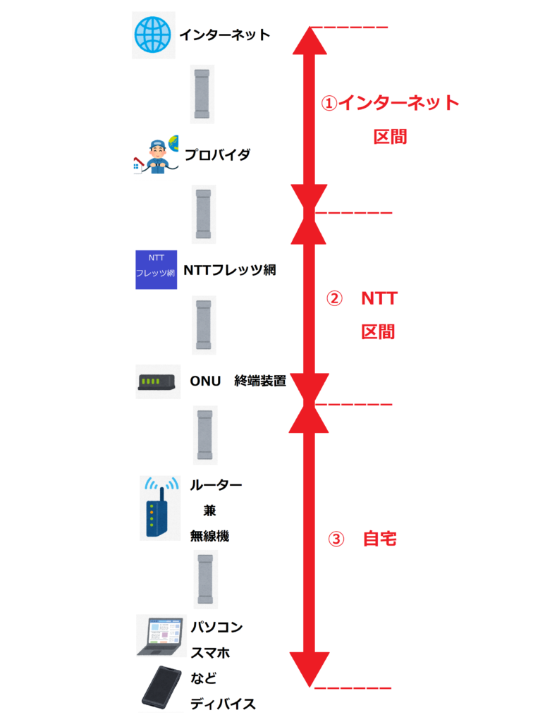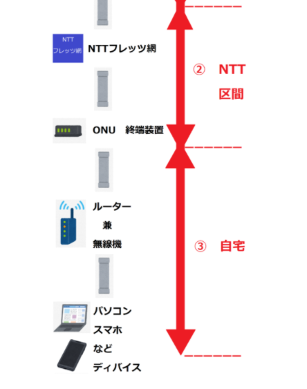 インターネットから自宅まで色々な機器を通してデータが届きます。そのどこかに問題があると速度が遅いという事になります。どこに問題があるのかまず3つに切り分けて考えてみましょう。