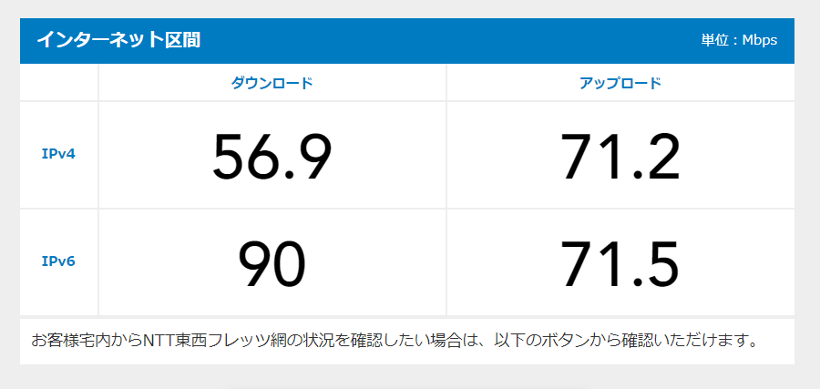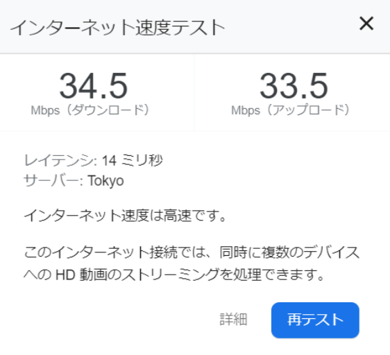 とりあえず原因が何なのかを探るとドコモ光が遅いということが分かりました。[スピードテスト]と検索すると出てくるインターネット回線速度計測ページをクリックして出てきた結果は以下の通りです。