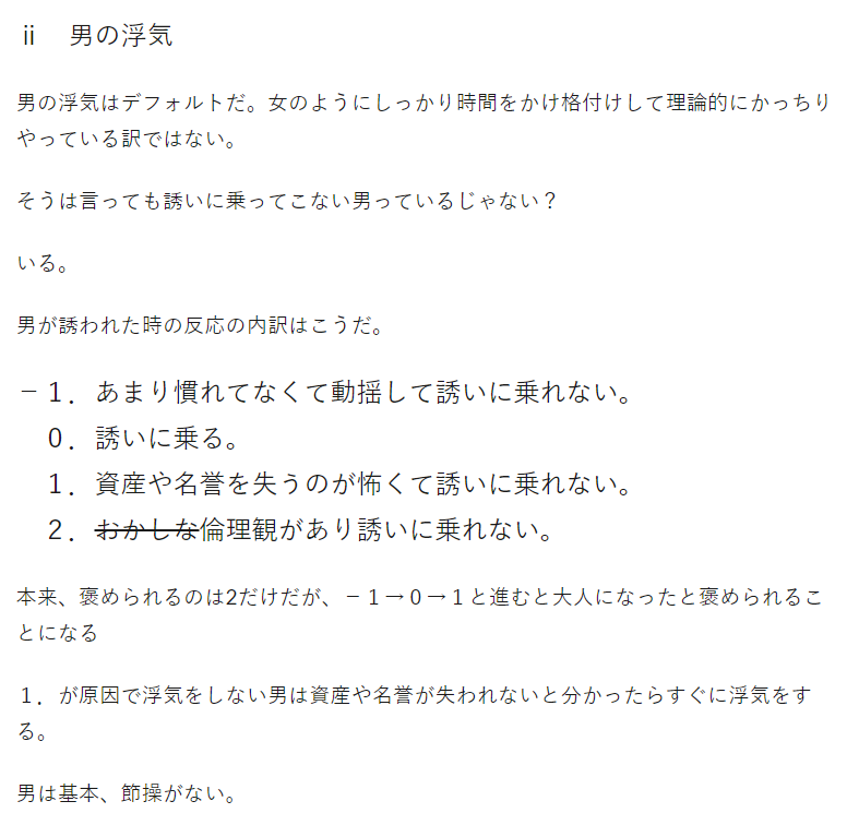 男の浮気はデフォルトで、-1→0→1と進むと成長することによって大人になったと褒められる。