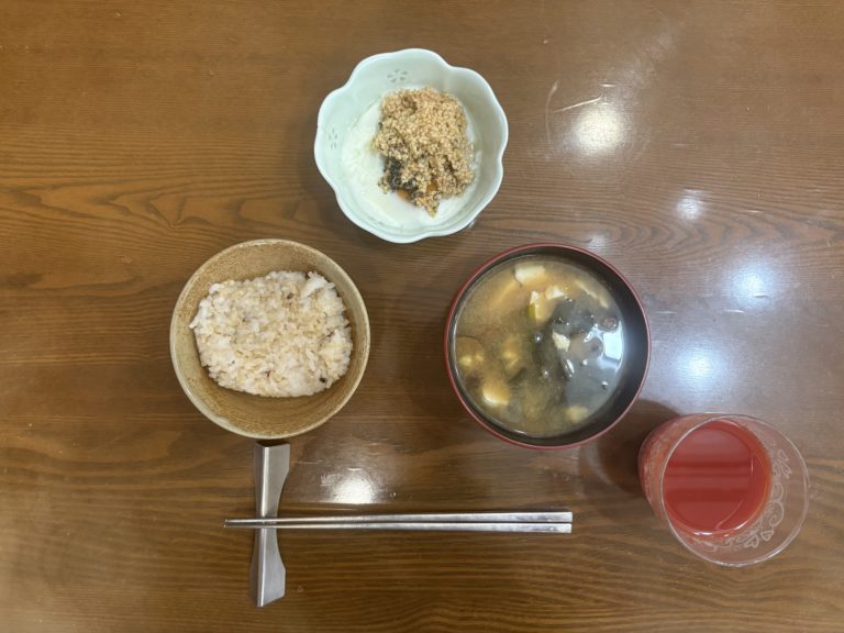 毎日の朝ごはん ①トマトジュース ②シジミ豆腐ワカメなめこの味噌汁 ③味の素40秒レンチン卵 ④ひきわり納豆黒酢黒すりごまエゴマオイル 凄い手間をかけているねと言われるが 作って食べて食器洗いまで 30分はかからない 20分ちょっとだと思う いきなりこの朝ごはんが完成したのではなく 作りこんでいるうちに こうなった これからも進化する可能性はあり!